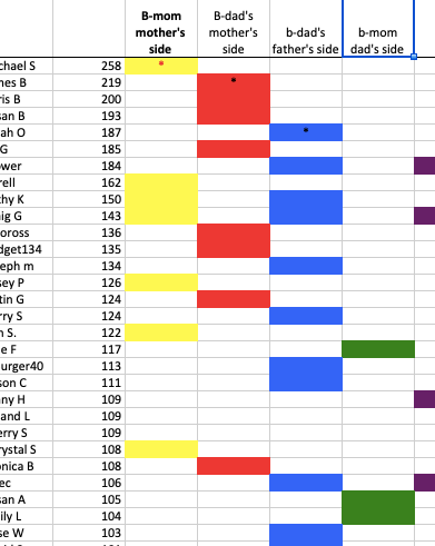 Basically, you consider a small subset of DNA matches, people with whom the test taker shares approximately 400cM to 90cMs with; their second and third cousins. Using a spreadsheet to record your matches, you click on the 1st second cousin in the list who shares about 400cMs with your test taker, then you click on “Shared Matches.” That is the list you record in your spreadsheet, assigning all those in this column a certain color. Arrow out. Then click on the next cousin (who you have not entered into you spreadsheet), then click on “Shared Matches” and record that list assigning them another color. Work you way through the cousin list until you get to your last cousin with whom the test taker shares 90cMs with. You will end up with at least four columns…and sometimes more, but don’t panic. With is information you will discover the surnames of the test takers grandparents. (If this technique intrigues you, I would encourage you to find another site that can explain it better!)