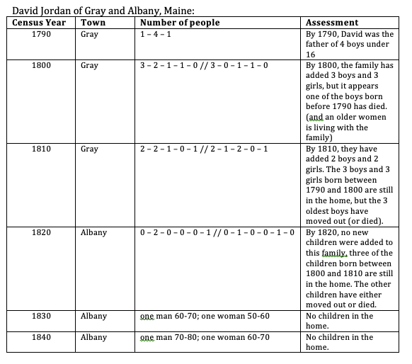 First locate your ancestor in the census and make a note of the number of people recorded in the home and where the family is living. If they never leave a particular town, well that is easy to follow, but if they move around, check maps and make sure the moves make sense. For demonstration purposes, we will study David Jordon of Maine. He was born about 1760 and died 30 May 1847 in Waterford, ME. He married twice, once in 1782 and again in 1785. Not all the names of all of his children are known. By studing the censuses we may be able to figure out how many children he had, total amount as well as number of boys and girls.
