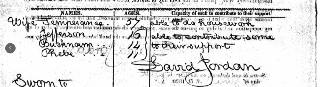 Page from David Jordan’s pension application naming the family he had living with him at that time.