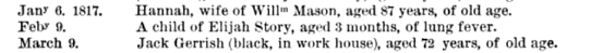 Although, they seem to have grown up poor, Jack and Anna’s children appear to have been more financially secure as adults. Elcy and Charles stayed in Dedham. Elcy lived to be 70 years old. She never married. When she died she left a will, giving her entire estate to the Mason Richards family. Elcy had almost $2000 worth of assets, her sister Susan, and her nieces and nephews contested the will. Charles married to Hannah Lewis and they had two daughters who grew to adulthood. Charles died in 1845 at 50 years old. Daughter Cloe married Philip Ames (1791-1858) and together they settled in Windsor, Vermont. Census records show they had about ten children, but only the names of four can be found. Cloe’s death date has not been found, but she appears to have died around 1845. Daughter Susan married Jeremiah Slocum (1788-1880ish), they settled in North Providence, Rhode Island and were the parents of nine children. Susan died in 1867.