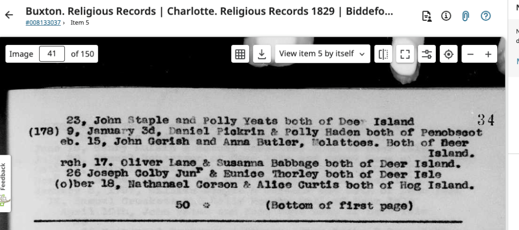 Jack was likely enslaved in Dedham most of his life, he could be one of three possible Jacks who appear in estate inventories between 1753 and 1764. The births of his children are recorded in Dedham vital records, as is his death. For some unknown reason, Jack settled briefly in Hancock County Maine. His marriage on February 15, 1787 to Anna Butler is recorded in Deer Isle records, and he is recorded in the 1790 census living in Conduskeag Plantation, Maine (today the greater Bangor area). He reports 3 “all others” living in the home, however, the census taker notes this is “Jack Garrish, a Mulatto, his wife & child.” We do not know who Jack’s parents were, nor to we know anything about his wife Anna “Nancy” Butler. Jack and Anna likely returned to Dedham in the early 1790s, and became the parents of five children: Elcy/Alice 1788, Cloe in 1792, Charles in 1794, Susan in 1797 and Makepeace in 1799. Makepeace died in young.
