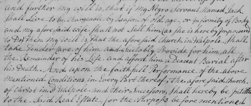 The pieces of documentation that exist on Jack and Hannah, indeed help to flesh out their lives. They lived on the fringe of Walpole society, most likely in poverty, and it seems they were not treated well. The Walpole church was charged with taking “tender care” of Jack, if they wanted to inherit a sizable piece of real estate. It is clear they met all his physical needs. He always had a roof over his head, food in his belly, and clothes on his back, but all those choices were made for him. Especially when it came to his wish to live with his wife Hannah. Jack may have been free according the Massachusetts Constitution, but it seems clear, that he was never free to make his own decisions.
