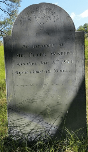 Joseph Lovell (1708-1759) was the son of Alexander Lovell and Elizabeth Dyer of Medfield. In 1739 he married Prudence Clark and together they had four children, only three grew to adulthood. Joseph was a farmer. When he died, he left half of his farm to his wife and the other half to his son Joseph, noting that Joseph would inherit his mother’s half when she died. To his daughters, he left them money. His estate was not inventoried, so the amount of real estate and personal estate it is unknown. However, in his will he mentioned his “servant,” saying: “I give my servant his freedom at thirty one years of age provided he serve my son Joseph Lovell willingly & faithfully and if not I give my son Joseph Lovell full power to sell him for his lifetime.” In 1769 Caesar Hunt alias Peter Warren, paid £13 6s 8p to Joseph Lovell (Jr.) for his freedom. In 1762, “Caesar Negro,” was paid 8s 11p for work regarding the estate of Lt. Timothy Clark. Quite possibly this is Caesar Hunt (alias Peter Warren) who was paid, illustrating that he was able to pick up paying jobs when he had some free time. In his emancipation papers, Lovell notes the receipt of the money, that Warren was a Mulatto slave having previously belonged to his father and who descended to him. He releases Warren from his service, but further notes that if Warren becomes idle and a chargeable threat to the Lovell estate, that Warren can be remanded back into “service” to the Lovell family. Warren moved to Medfield where he lived the rest of his life. There is no record of him marrying or having children, but he did serve in the militia during the Revolutionary War. Warren died in 1814, his headstone in Vine Lake Cemetery, Medfield says: “A respectable man of colour.”